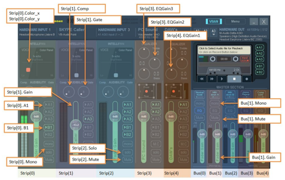 스트립 인덱스는 Voicemeeter 버전과 관련된 제로 기반 인덱스(Voicemeeter에 3 스트립, Voicemeeter Banana 5 스트립)