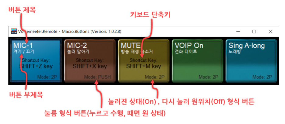 Voicemeeter와 함께 제공 및 설치되는 매크로 버튼 애플리케이션(Macro Buttons Application)을 사용하면 프로그래밍 가능한 버튼을 만들어 Voicemeeter 매개 변수를 제어할 수 있습니다.여러 개(총 80개)의 버튼으로 되어 있고 각각 역할을 설정할 수 있습니다.