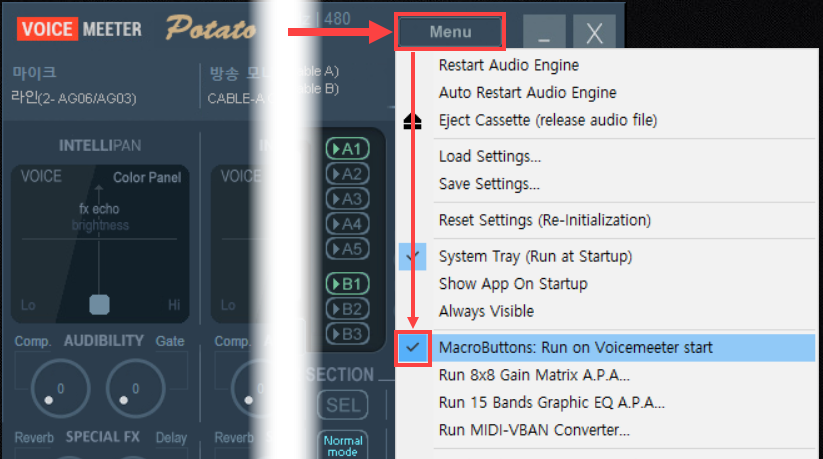'Macro Buttons Run on Voicemeeter start' 보이스미터 시작 시 매크로 버튼 실행에 체크를 합니다