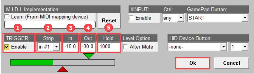 트리거는 선택된 입력 스트립 레벨에서 2개의 임곗값에 따라 버튼을 처리할 수 있습니다. IN 임곗값(녹색 커서)은 레벨이 넘어가면 버튼이켜지고, OUT 임곗값(적색 커서)은 레벨이 내려가면 버튼이 꺼집니다. HOLD 시간은 게이트를 열 수 있는 최소 시간을 정의합니다.